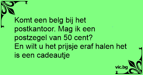 Komt een belg bij het postkantoor. Mag ik een postzegel van 50 cent?<br />En wilt u het prijsje eraf halen het is een cadeautje
