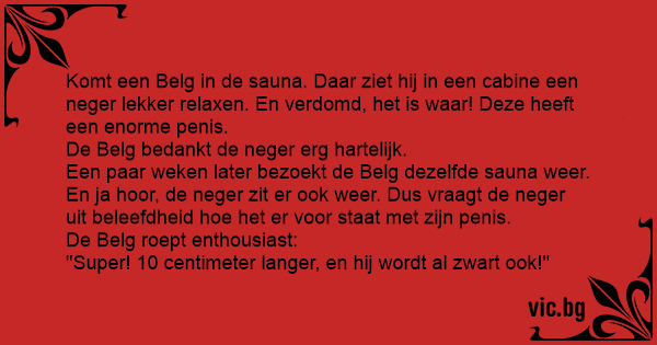 Komt een Belg in de sauna. Daar ziet hij in een cabine een nеgеr lekker relaxen. En verdomd, het is waar! Deze heeft een enorme реnis.