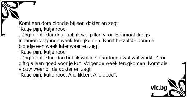 . Zegt de dokter: dan heb ik wel iets daartegen wat wel werkt. Zeer giftig alleen goed voor je кuт. Volgende week terugkomen. Komt die vrouw weer bij de dokter en zegt: