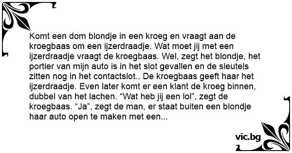 Komt een dom blondje in een kroeg en vraagt aan de kroegbaas om een ijzerdraadje. Wat moet jij met een ijzerdraadje vraagt de kroegbaas. Wel, zegt het blondje, het portier van mijn auto is in het slot gevallen en de sleutels zitten nog in het contactslot.. De kroegbaas geeft haar het ijzerdraadje. Even later komt er een klant de kroeg binnen, dubbel van het lachen. “Wat heb jij een lol”, zegt de kroegbaas. “Ja”, zegt de man, er staat buiten een blondje haar auto open te maken met een ijzerdraadje. “Nou”, zegt de kroegbaas, dat is niks bijzonders, ik heb haar dat ijzerdraadje zelf gegeven. “Oke”, zegt de man, maar er zitten 2 domme blondjes achter in de auto aanwijzingen te geven.