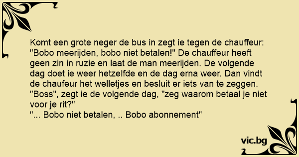 "Bobo meerijden, bobo niet betalen!" De chauffeur heeft geen zin in ruzie en laat de man meerijden. De volgende dag doet ie weer hetzelfde en de dag erna weer. Dan vindt de chaufeur het welletjes en besluit er iets van te zeggen. "Boss", zegt ie de volgende dag, "zeg waarom betaal je niet voor je rit?"