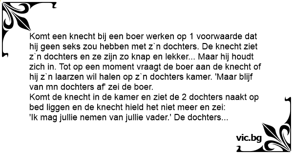 Komt de knecht in de kamer en ziet de 2 dochters naakt op bed liggen en de knecht hield het niet meer en zei: