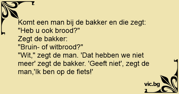 "Wit," zegt de man. 'Dat hebben we niet meer' zegt de bakker. 'Geeft niet', zegt de man,'Ik ben op de fiets!'