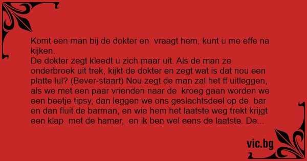 De dokter zegt kleedt u zich maar uit. Als de man ze onderbroek uit trek, kijkt de dokter en zegt wat is dat nou een platte lul? (Bever-staart) Nou zegt de man zal het ff uitleggen, als we met een paar vrienden naar de kroeg gaan worden we een beetje tipsy, dan leggen we ons geslachtsdeel op de bar en dan fluit de barman, en wie hem het laatste weg trekt krijgt een klap met de hamer, en ik ben wel eens de laatste. De dokter kijkt nog eens en zegt maar daar kan ik niks meer aan doen. De man zegt maar daar kom ik niet voor ,maar waar voor dan zegt de dokter? Ik kom voor me oren want ik hооr het fluitje niet!