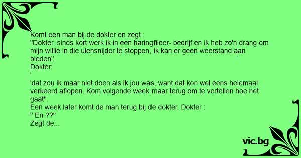 ''Dokter, sinds kort werk ik in een haringfileer- bedrijf en ik heb zo'n drang om mijn willie in die uiensnijder te stoppen, ik kan er geen weerstand aan bieden''.