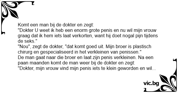 "Dat komt goed uit, mijn andere broer is ook plastisch chirurg en gespecialiseerd in het naar achteren verplaatsen van ballen, waardoor je реnis weer wat groter wordt." De man gaat naar die andere broer en ondergaat de operatie. Na een paar maanden komt de man weer bij de dokter. "Dokter, mijn vrouw is erg tevreden, maar ik niet, want elke keer als ik moet schijten, sсhijт ik mijn ballen eronder."