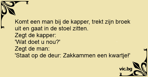 Komt een man bij de kapper, trekt zijn broek uit en gaat in de stoel zitten.