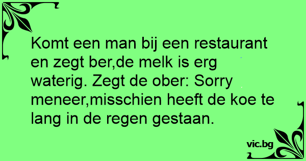 Komt een man bij een restaurant en zegt ber,de melk is erg waterig. Zegt de ober: Sorry meneer,misschien heeft de koe te lang in de regen gestaan.