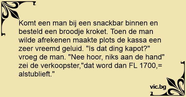 Komt een man bij een snackbar binnen en besteld een broodje kroket. Toen de man wilde afrekenen maakte plots de kassa een zeer vreemd geluid. "Is dat ding kapot?" vroeg de man. "Nee hооr, niks aan de hand" zei de verkoopster,"dat word dan FL 1700,= alstublieft."