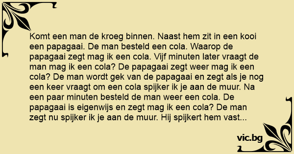 Komt een man de kroeg binnen. Naast hem zit in een kooi een papagaai. De man besteld een cola. Waarop de papagaai zegt mag ik een cola. Vijf minuten later vraagt de man mag ik een cola? De papagaai zegt weer mag ik een cola? De man wordt gek van de papagaai en zegt als je nog een keer vraagt om een cola spijker ik je aan de muur. Na een paar minuten besteld de man weer een cola. De papagaai is eigenwijs en zegt mag ik een cola? De man zegt nu spijker ik je aan de muur. Hij spijkert hem vast naast het kruisbeeld van Jezus. Vraagt de papagaai aan Jezus vroeg jij ook om een cola?