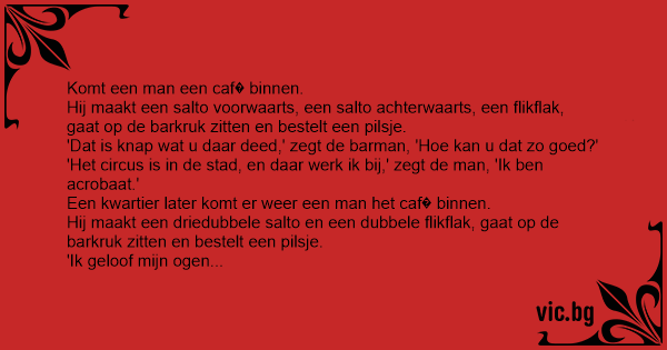 Hij maakt een driedubbele salto en een dubbele flikflak, gaat op de barkruk zitten en bestelt een pilsje.