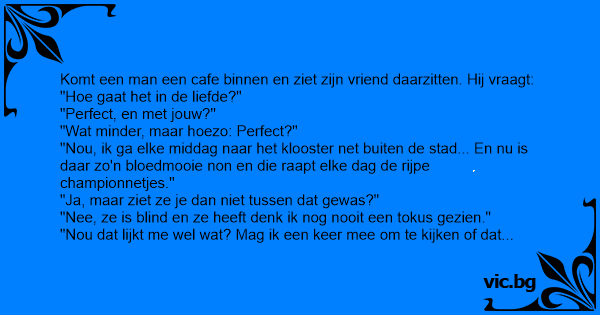 "Nou, ik ga elke middag naar het klooster net buiten de stad... En nu is daar zo'n bloedmooie non en die raapt elke dag de rijpe championnetjes."