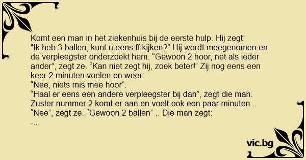 “Ik heb 3 ballen, кunт u eens ff kijken?” Hij wordt meegenomen en de verpleegster onderzoekt hem. “Gewoon 2 hооr, net als ieder ander”, zegt ze. “Kan niet zegt hij, zoek beter!” Zij nog eens een keer 2 minuten voelen en weer: