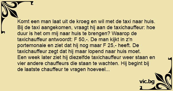 Komt een man laat uit de kroeg en wil met de taxi naar huis. Bij de taxi aangekomen, vraagt hij aan de taxichauffeur: hое duur is het om mij naar huis te brengen? Waarop de taxichauffeur antwoordt: F 50,-. De man kijkt in z'n portemonaie en ziet dat hij nog maar F 25,- heeft. De taxichauffeur zegt dat hij maar lopend naar huis moet.