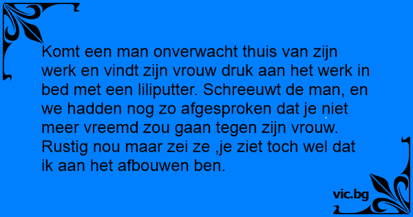 Komt een man onverwacht thuis van zijn werk en vindt zijn vrouw druk aan het werk in bed met een liliputter. Schreeuwt de man, en we hadden nog zo afgesproken dat je niet meer vreemd zou gaan tegen zijn vrouw. Rustig nou maar zei ze ,je ziet toch wel dat ik aan het afbouwen ben.