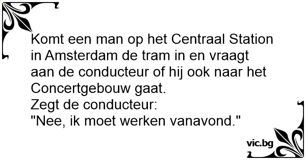 Komt een man op het Centraal Station in Amsterdam de tram in en vraagt aan de conducteur of hij ook naar het Concertgebouw gaat.