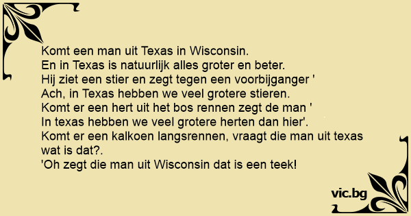 Komt er een kalkoen langsrennen, vraagt die man uit texas wat is dat?.