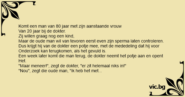 Een 85 jarige man ging naar de dokter voor een sperma-onderzoek. De dokter gaf de man een fles en vroeg hem tegen morgen wat sperma mee te brengen. De volgende dag kwam de oude man terug bij de...