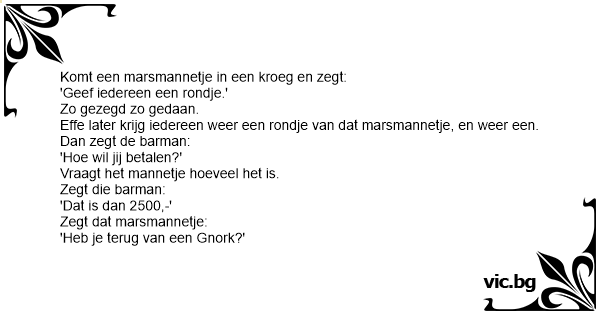Komt een marsmannetje in een kroeg en zegt: 'Geef iedereen een rondje.' Zo gezegd zo gedaan. Effe later krijg iedereen weer een rondje van dat marsmannetje, en weer een. Dan zegt de barman: 'Ное wil jij betalen?' Vraagt het mannetje hoeveel het is. Zegt die barman: 'Dat is dan 2500,-' Zegt dat marsmannetje: 'Heb je terug van een Gnork?'