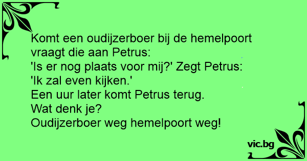 Komt een oudijzerboer bij de hemelpoort vraagt die aan Petrus:<br />'Is er nog plaats voor mij?' Zegt Petrus:<br />'Ik zal even kijken.'<br />Een uur later komt Petrus terug.<br />Wat denk je?<br />Oudijzerboer weg hemelpoort weg!