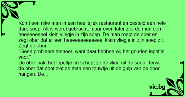 Komt een rijke man in een heel sjiek restaurant en besteld een hele dure soep. Alles wordt gebracht, maar even later ziet de man een heeeeeeeeel klein vliegje in zijn soep. De man roept de ober en zegt ober dat er een heeeeeeeeeeeeel klein vliegje in zijn soep zit. Zegt de ober: