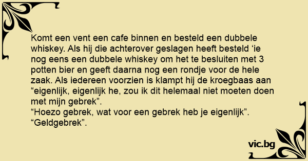 Komt een vent een cafe binnen en besteld een dubbele whiskey. Als hij die achterover geslagen heeft besteld ‘ie nog eens een dubbele whiskey om het te besluiten met 3 potten bier en geeft daarna nog een rondje voor de hele zaak. Als iedereen voorzien is klampt hij de kroegbaas aan “eigenlijk, eigenlijk he, zou ik dit helemaal niet moeten doen met mijn gebrek”.