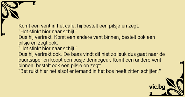 Dus hij vertrekt ook. De baas vindt dit niet zo leuk dus gaat naar de buurtsuper en koopt een busje dennegeur. Komt een andere vent binnen, bestelt ook een pilsje en zegt: