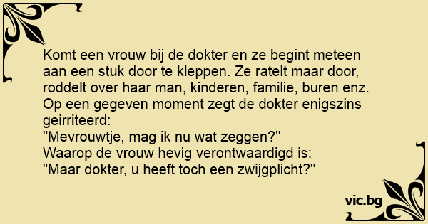 Komt een vrouw bij de dokter en ze begint meteen aan een stuk door te kleppen. Ze ratelt maar door, roddelt over haar man, kinderen, familie, buren enz. Op een gegeven moment zegt de dokter enigszins geirriteerd: