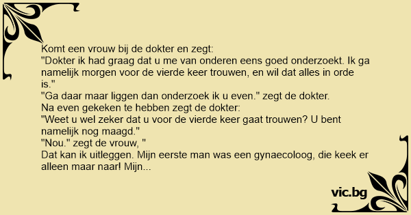 "Dokter ik had graag dat u me van onderen eens goed onderzoekt. Ik ga namelijk morgen voor de vierde keer trouwen, en wil dat alles in orde is."