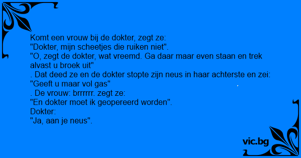 "O, zegt de dokter, wat vreemd. Ga daar maar even staan en trek alvast u broek uit"