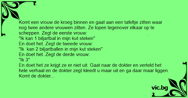 Komt een vrouw de kroeg binnen en gaat aan een tafeltje zitten waar nog twee andere vrouwen zitten. Ze lopen tegenover elkaar op te scheppen. Zegt de eerste vrouw: