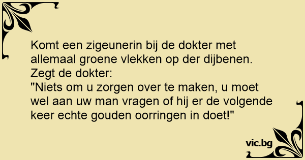 Komt een zigeunerin bij de dokter met allemaal groene vlekken op der dijbenen. Zegt de dokter: