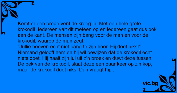 Er komt een brede man met een grote krokodil de kroeg in lopen. Iedereen kijkt verbaast naar de krokodil en deinzen allemaal een stukje achteruit. De man zegt: “Er is geen reden om bang te zijn,...