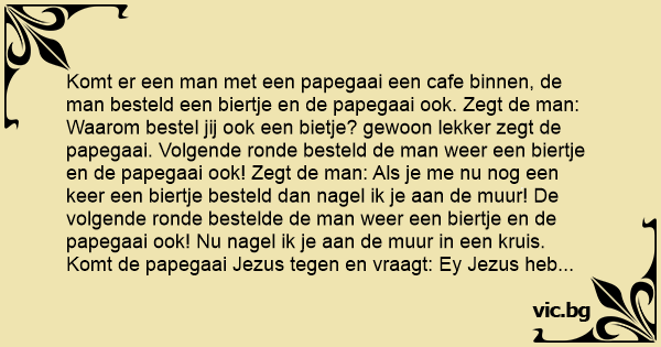 Komt er een man met een papegaai een cafe binnen, de man besteld een biertje en de papegaai ook. Zegt de man: Waarom bestel jij ook een bietje? gewoon lekker zegt de papegaai. Volgende ronde besteld de man weer een biertje en de papegaai ook! Zegt de man: Als je me nu nog een keer een biertje besteld dan nagel ik je aan de muur! De volgende ronde bestelde de man weer een biertje en de papegaai ook! Nu nagel ik je aan de muur in een kruis. Komt de papegaai Jezus tegen en vraagt: Ey Jezus heb je ook te veel biertjes op van de baasje?