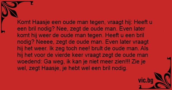 Komt Haasje een oude man tegen, vraagt hij: Heeft u een bril nodig? Nee, zegt de oude man. Even later komt hij weer de oude man tegen. Heeft u een bril nodig? Neeee, zegt de oude man. Even later vraagt hij het weer. Ik zeg toch nee! brult de oude man. Als hij het voor de vierde keer vraagt zegt de oude man woedend: Ga weg, ik kan je niet meer zien!!! Zie je wel, zegt Haasje, je hebt wel een bril nodig.