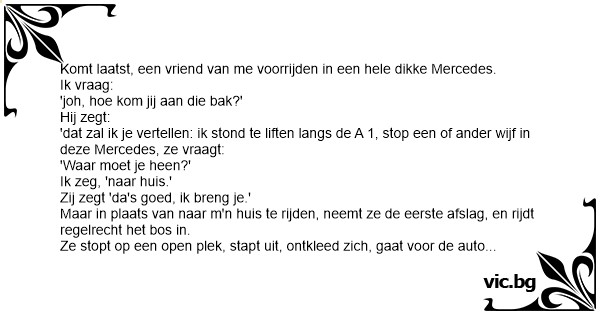 'dat zal ik je vertellen: ik stond te liften langs de A 1, stop een of ander wijf in deze Mercedes, ze vraagt: