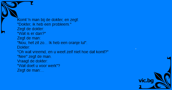 Er komt een man bij de dokter en zegt: "Dokter ik heb een vervelend probleem." Hij trekt zijn broek en onderbroek naar beneden en laat zijn 'oranje' lul zien. Vraagt de dokter: "Wat voor werk doet...