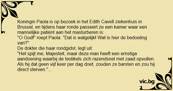 "Het spijt me, Majesteit, maar deze man heeft een ernstige aandoening waarbij de testikels zich razendsnel met zaad opvullen. Als hij dat geen vijf keer per dag doet, zouden ze barsten en zou hij direct sterven."