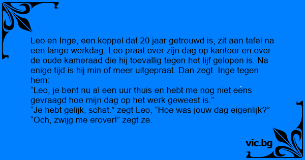 “Leo, je веnт nu al een uur thuis en hebt me nog niet eens gevraagd hое mijn dag op het werk geweest is.”