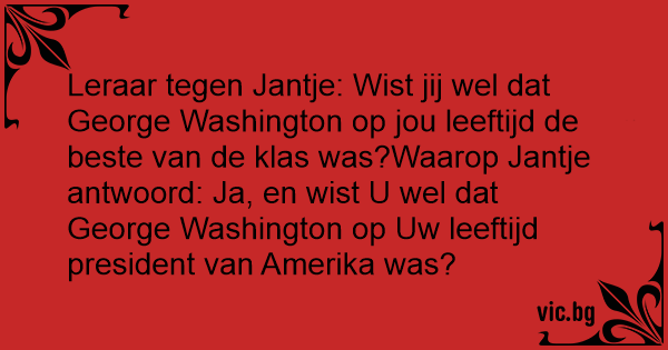 Leraar tegen Jantje: Wist jij wel dat George Washington op jou leeftijd de beste van de klas was?Waarop Jantje antwoord: Ja, en wist U wel dat George Washington op Uw leeftijd president van Amerika was?