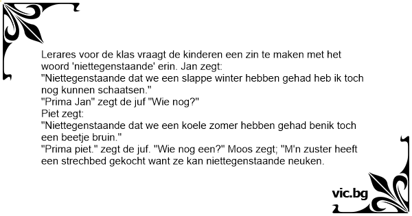 Lerares voor de klas vraagt de kinderen een zin te maken met het woord 'niettegenstaande' erin. Jan zegt: