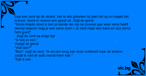 Liep een vent op de strand, ziet ie iets glimmen hij pakt het op en maakt het schoon. Komt er ineens een geest uit. Zegt de geest: