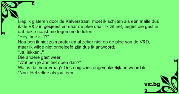 Liep ik gisteren door de Kalverstraat, moet ik schijten als een malle dus ik de V&D in gesjeest en naar de plee daar. Ik zit net, begint die gast in dat hokje naast me tegen me te lullеn: