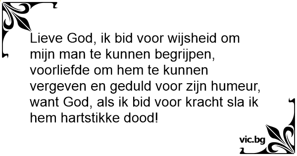 Lieve God, ik bid voor wijsheid om mijn man te kunnen begrijpen, voorliefde om hem te kunnen vergeven en geduld voor zijn humeur, want God, als ik bid voor kracht sla ik hem hartstikke dood!