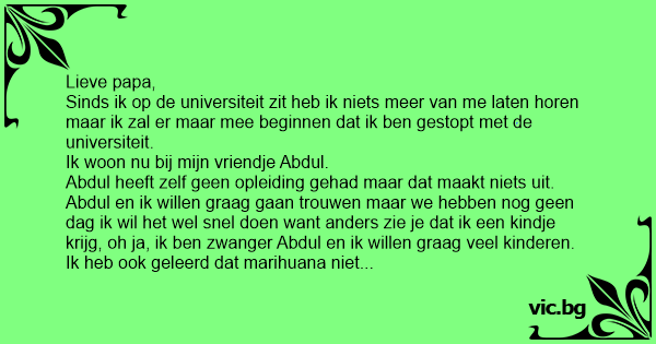 PS pap ik hoop dat je niet al te erg geschrokken веnт maar ik heb geen vriendje, ik ben niet zwanger en ik gebruik niks, ik wou alleen bewijzen dat er veelergere dingen zijn dan een slecht rapport, de mijne licht op mijn kastje en ik zit gewoon op de universiteit .