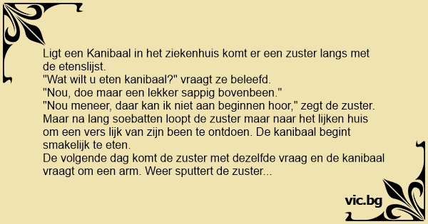 "Nee," antwoordt de kanibaal, "ik heb gehoord dat er iemand is binnen gebracht met een open rug, dan kan ik lekker soppen!"