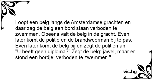 Loopt een belg langs de Amsterdamse grachten en daar zag de belg een bord staan verboden te zwemmen. Opeens valt de belg in de gracht. Even later komt de politie en de brandweerman bij te pas. Even later komt de belg bij en zegt de politieman: