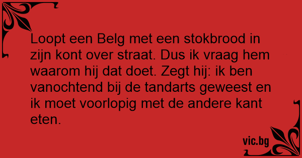 Loopt een Belg met een stokbrood in zijn kont over straat. Dus ik vraag hem waarom hij dat doet. Zegt hij: ik ben vanochtend bij de tandarts geweest en ik moet voorlopig met de andere kant eten.