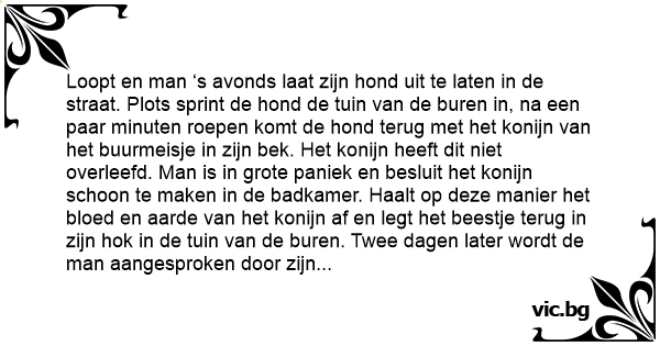 Loopt en man ‘s avonds laat zijn hond uit te laten in de straat. Plots sprint de hond de tuin van de buren in, na een paar minuten roepen komt de hond terug met het konijn van het buurmeisje in zijn век. Het konijn heeft dit niet overleefd. Man is in grote paniek en besluit het konijn schoon te maken in de badkamer. Haalt op deze manier het bloed en aarde van het konijn af en legt het beestje terug in zijn hok in de tuin van de buren. Twee dagen later wordt de man aangesproken door zijn buurman en zegt:
