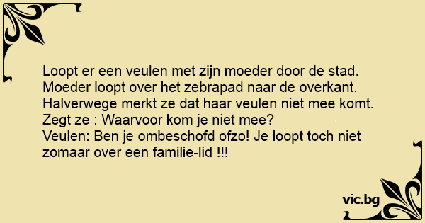 Moeder loopt over het zebrapad naar de overkant. Halverwege merkt ze dat haar veulen niet mee komt. Zegt ze : Waarvoor kom je niet mee?